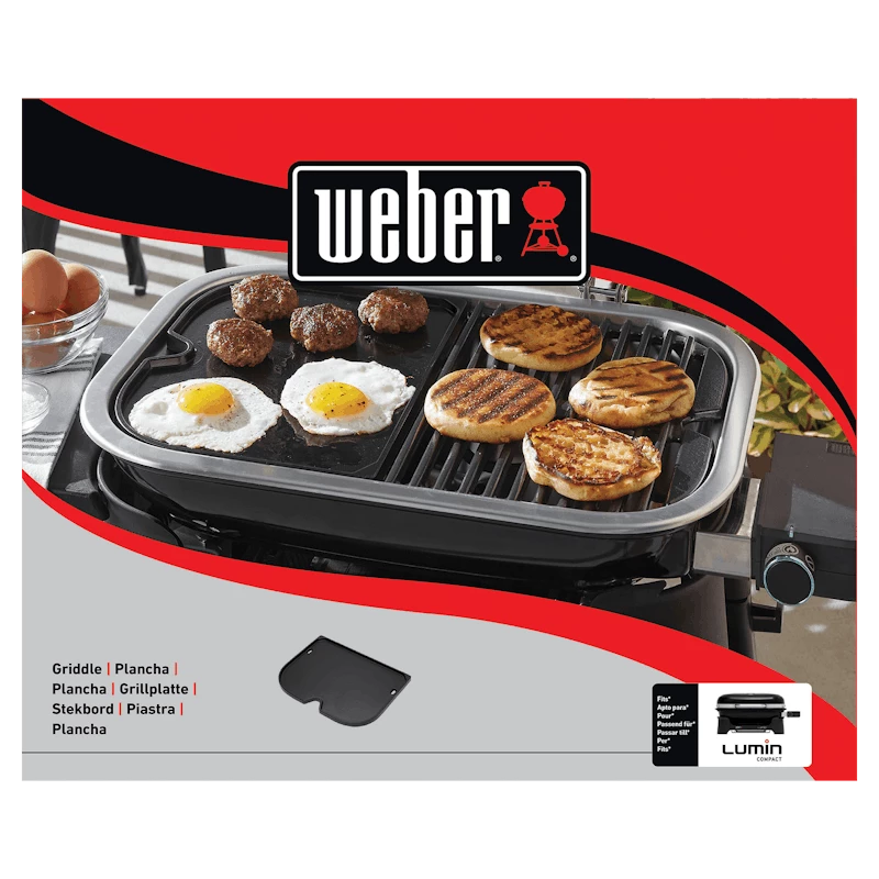 Unlock even more delicious possibilities with this Griddle for your Lumin* Compact electric grill. It easily converts your Lumin Compact grill’s surface so you can whip up pancakes and eggs in the morning and fajitas and quesadillas at night. The porcelain-enamel cast-iron surface requires no seasoning, evenly distributes heat and prevents food from sticking. And after everyone’s had their fill, it cleans easily with soap and water. *LUMIN is a trademark of Weber-Stephen Products LLC and is the subject of pending registrations or applications in the United States and other countries.