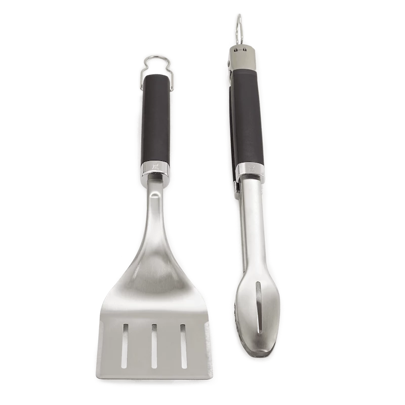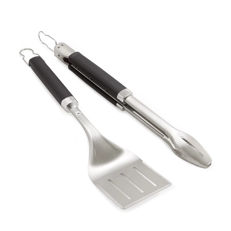 The Precision Grill Tongs & Spatula Set is designed for performance. Both feature a durable stainless-steel construction and soft-touch handle for comfort and control. The hands-free locking tongs are designed with a flat front edge that provides a secure grip as you lift and turn fragile foods. The spatula features a 3-sided beveled edge to easily slide under foods. Both tools are dishwasher-safe for easy cleaning.