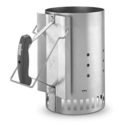 Get your fire burning quick with the must-have tool for all charcoal grillers. The durable, aluminized steel Rapidfire Chimney Starter has two handles to provide optimal control when pouring hot briquettes—wearing gloves, just grab its thermoplastic handle with one hand and its top wire handle with your other hand to direct fuel onto your charcoal grate. Its cylindrical canister holds enough charcoal to fill your kettle, and its cone-shaped bottom ensures that briquettes light quickly and evenly. To use your Rapidfire Chimney Starter, simply place it over a lighter cube or crumpled newspaper, light your preferred fire starter, and you’re well on your way to burning red-hot briquettes—in less time and completely lighter fluid free.